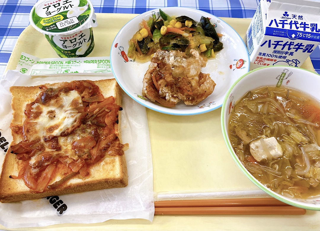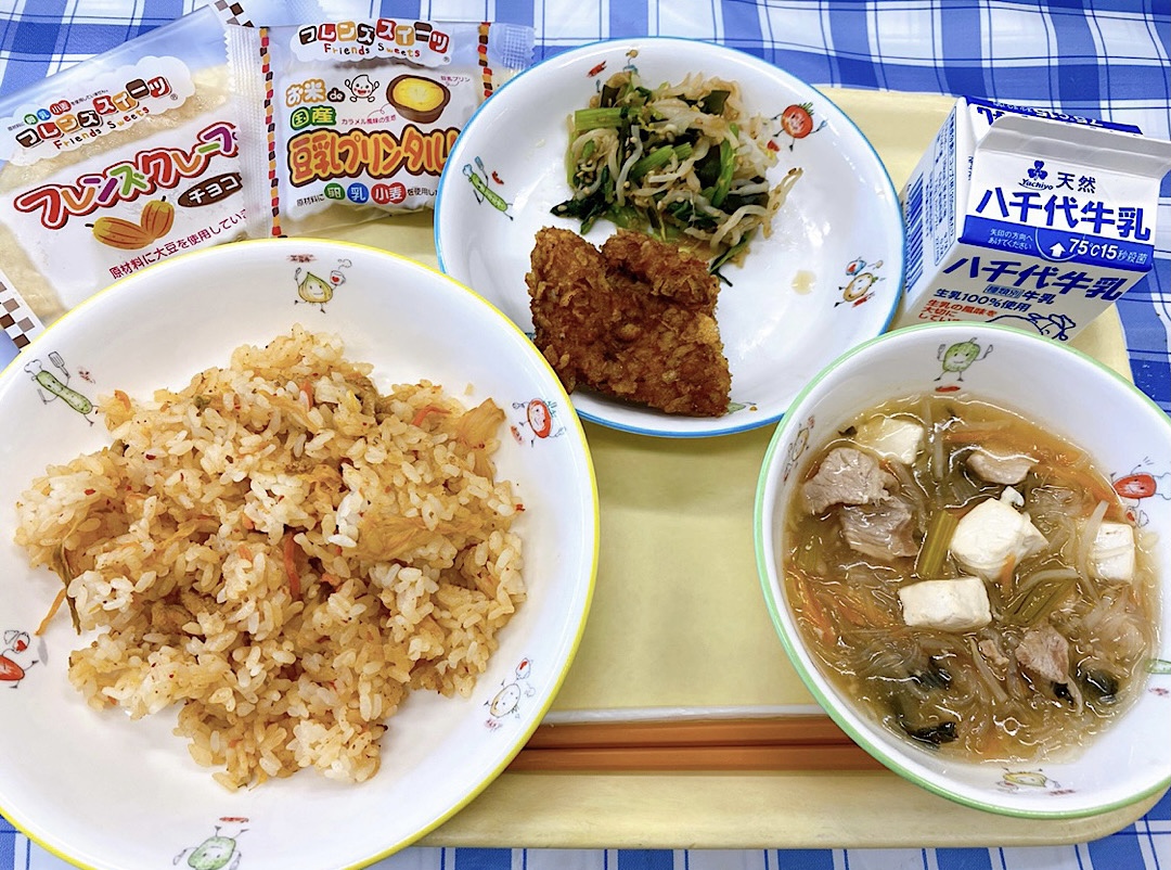 キムチごはん、ヤンニャムチキン、卵入りトックスープ、牛乳