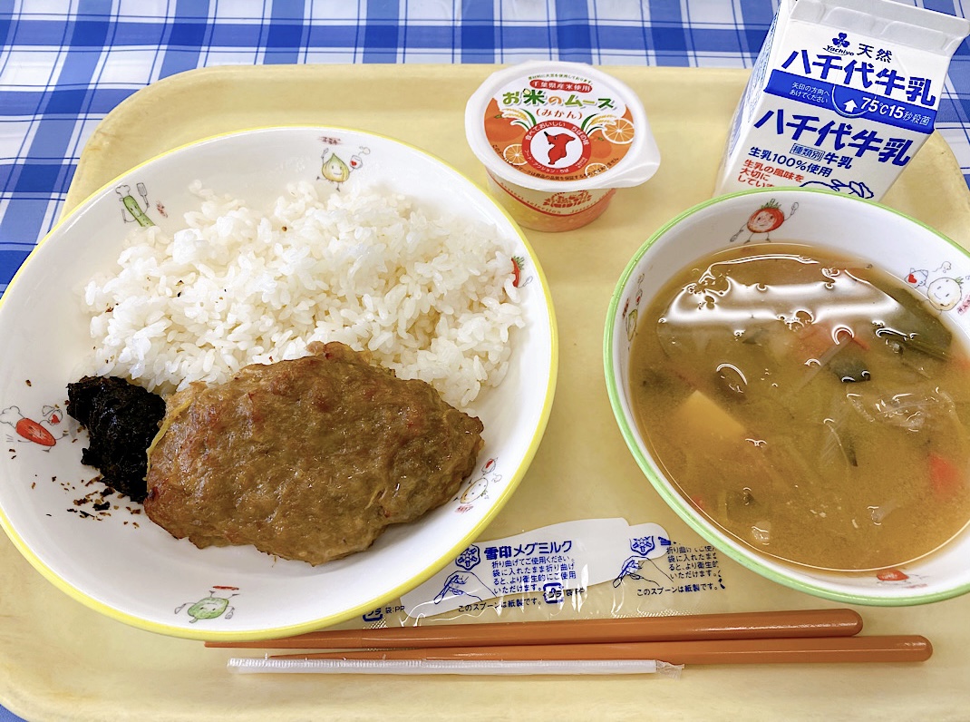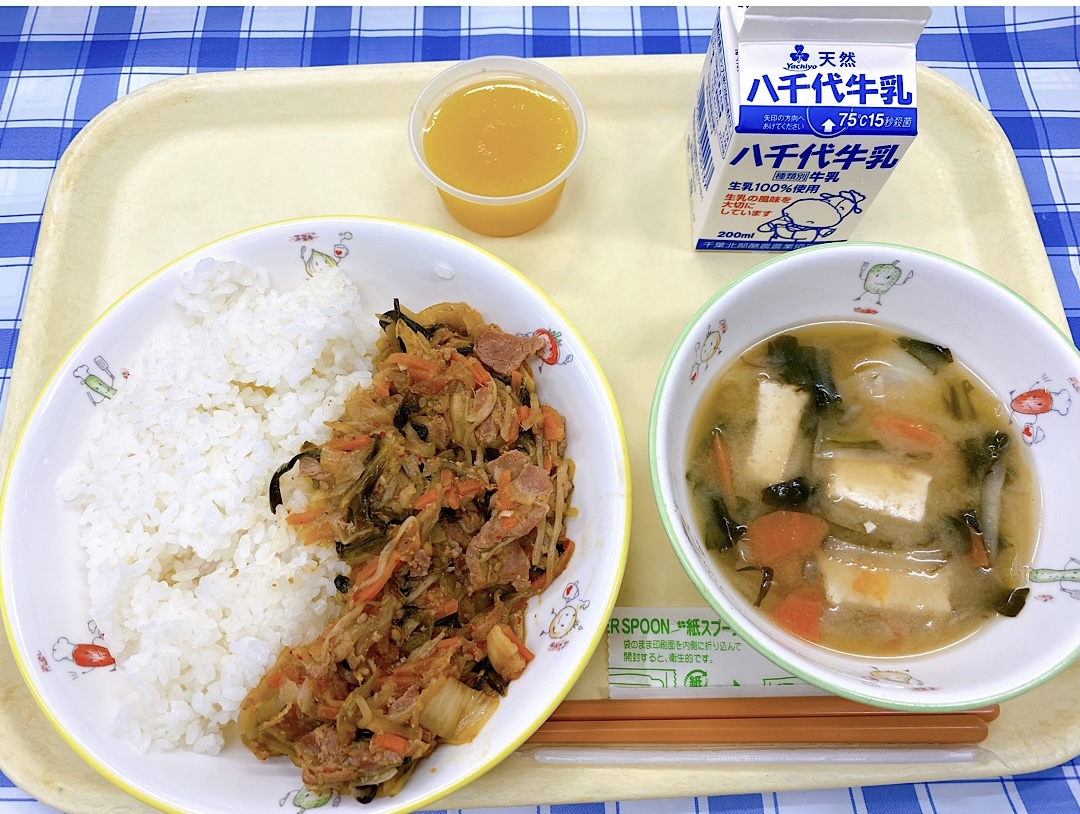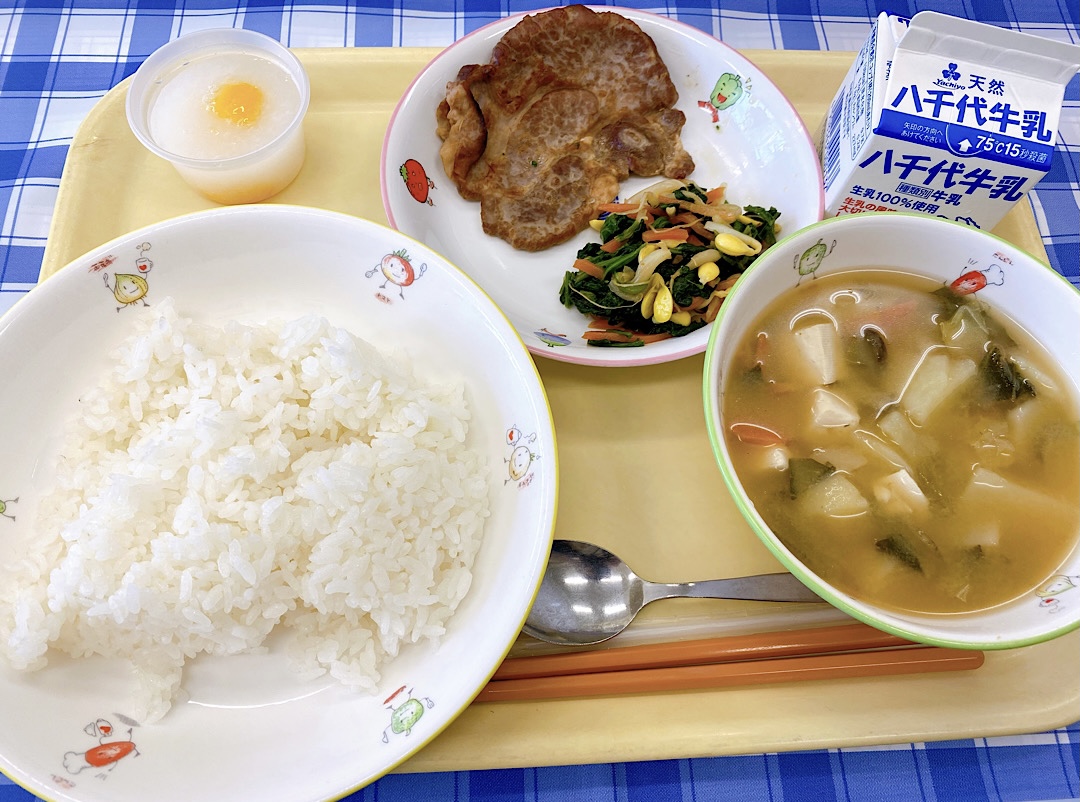 【千産千消献立】ごはん、千葉県産のりの佃煮、豚肉の三味焼き、さつま汁、黒蜜きな粉もち、牛乳