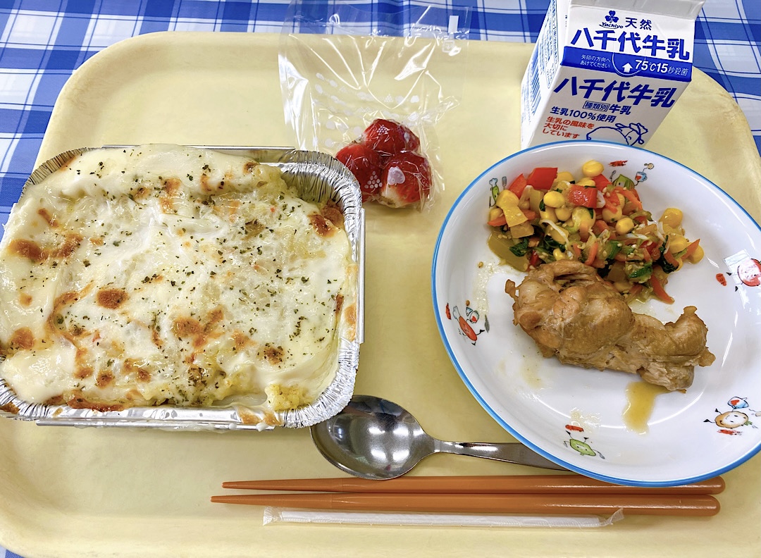 ミラノ風ドリア、チキンアドボー、カラフルサラダ、牛乳