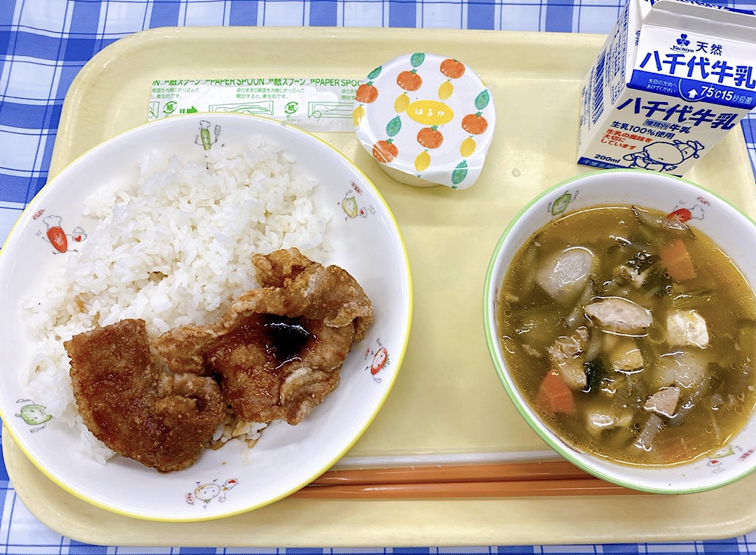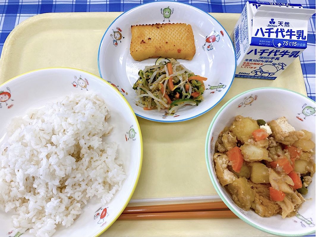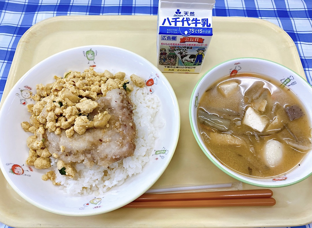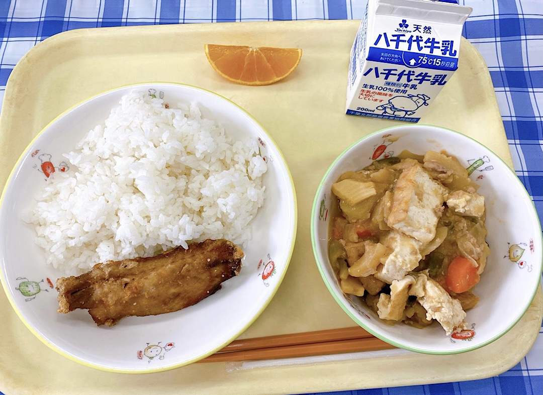 ごはん、あじの唐揚げ、生揚げの肉味噌煮、夢オレンジ、牛乳