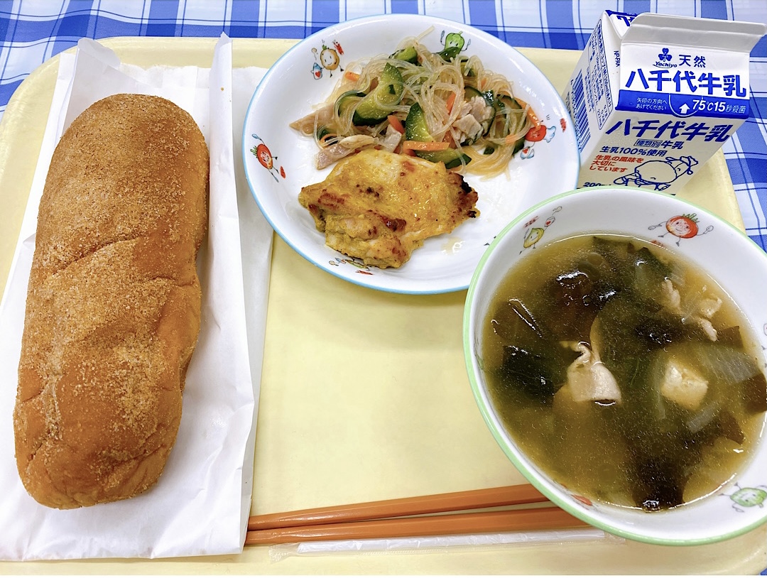 黒糖パン、鶏肉のアップルソース、ごぼうサラダ、ミネストローネ、牛乳