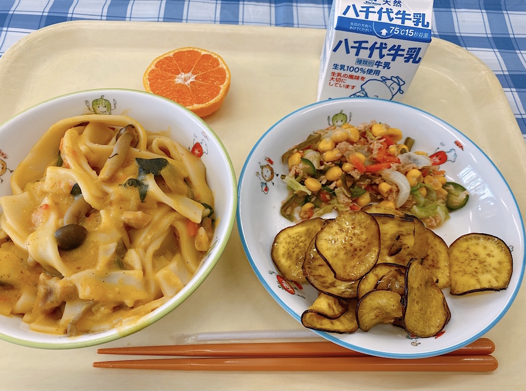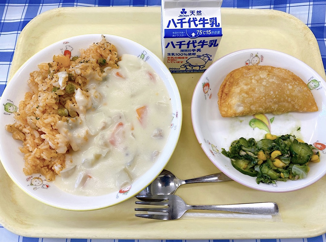 【ハロウィン献立】チキンライス、秋野菜のクリームシチュー、コーンサラダ、かぼちゃの包み揚げ、牛乳