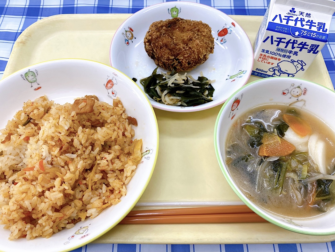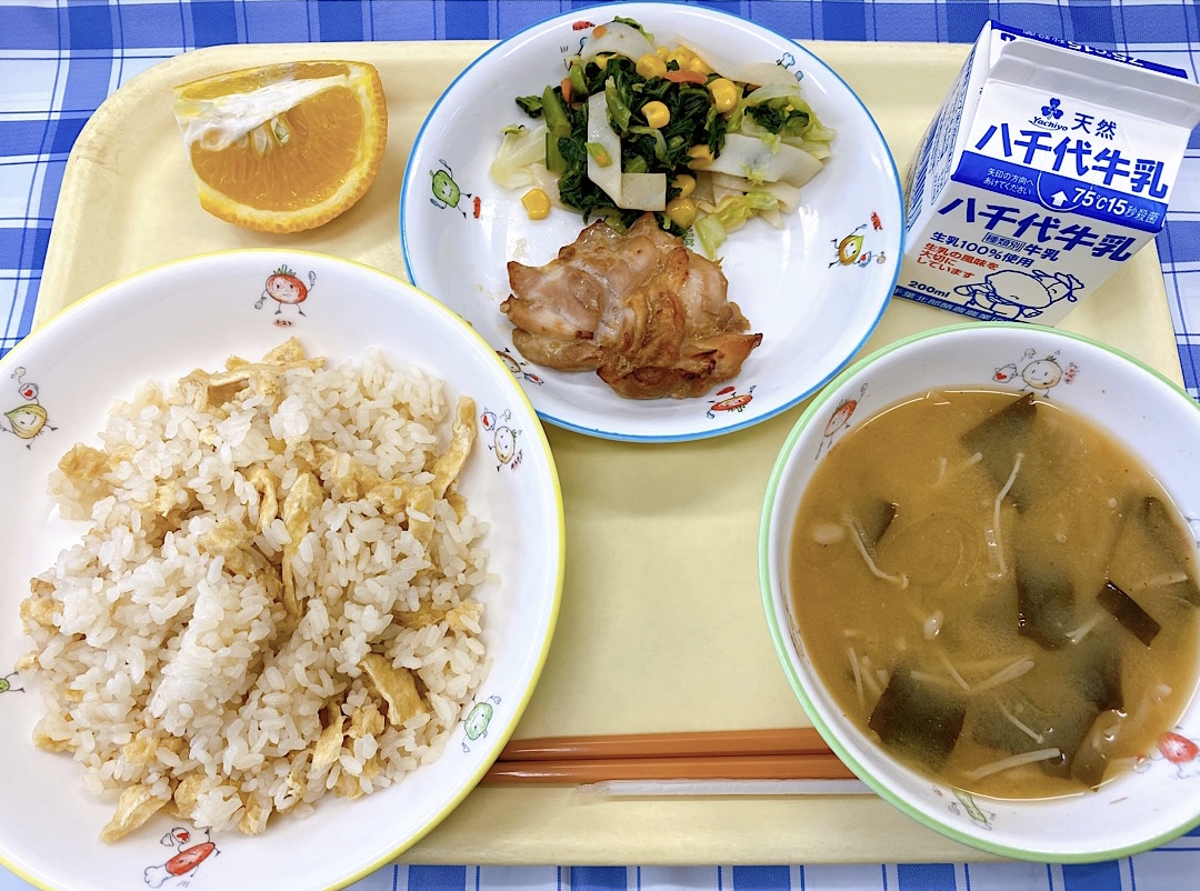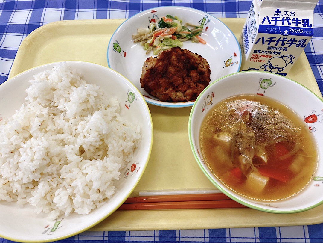 きつねごはん、キャベツメンチ、大根の味噌汁、牛乳