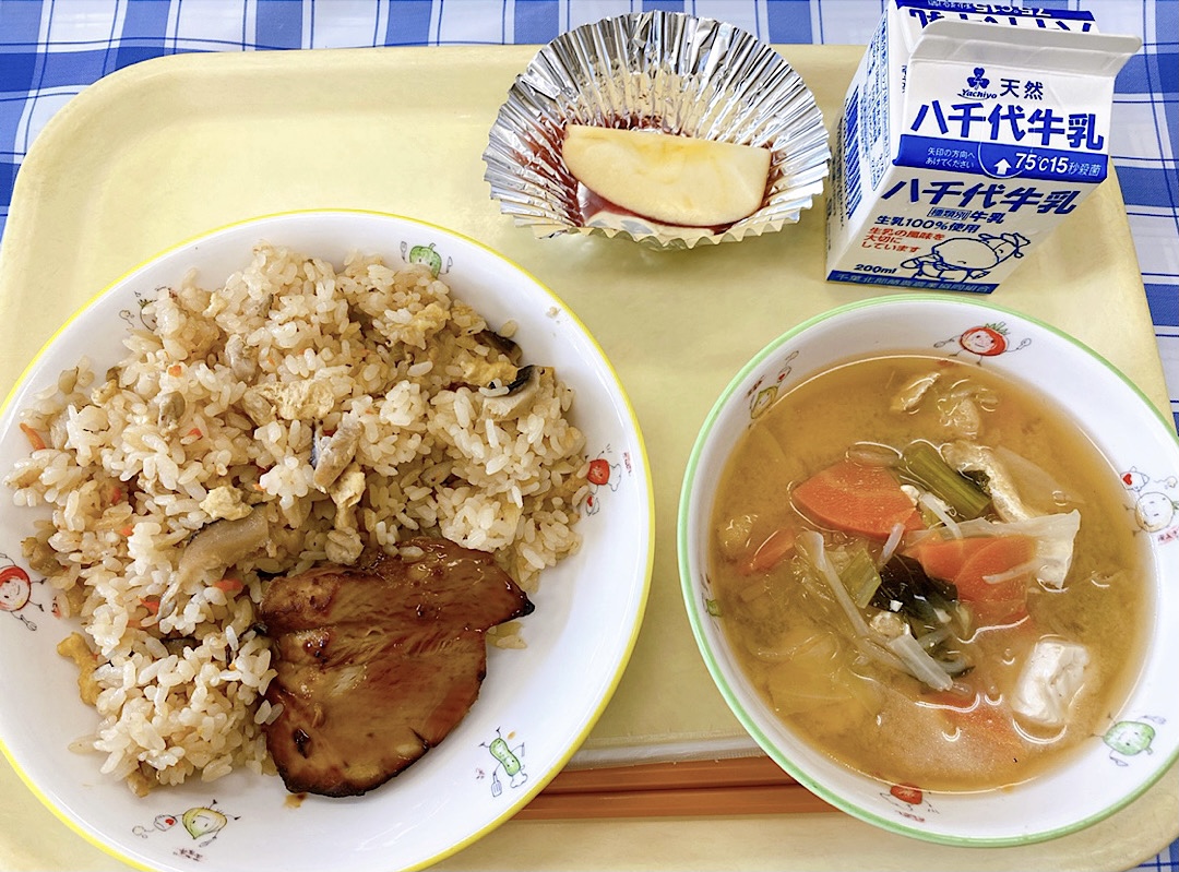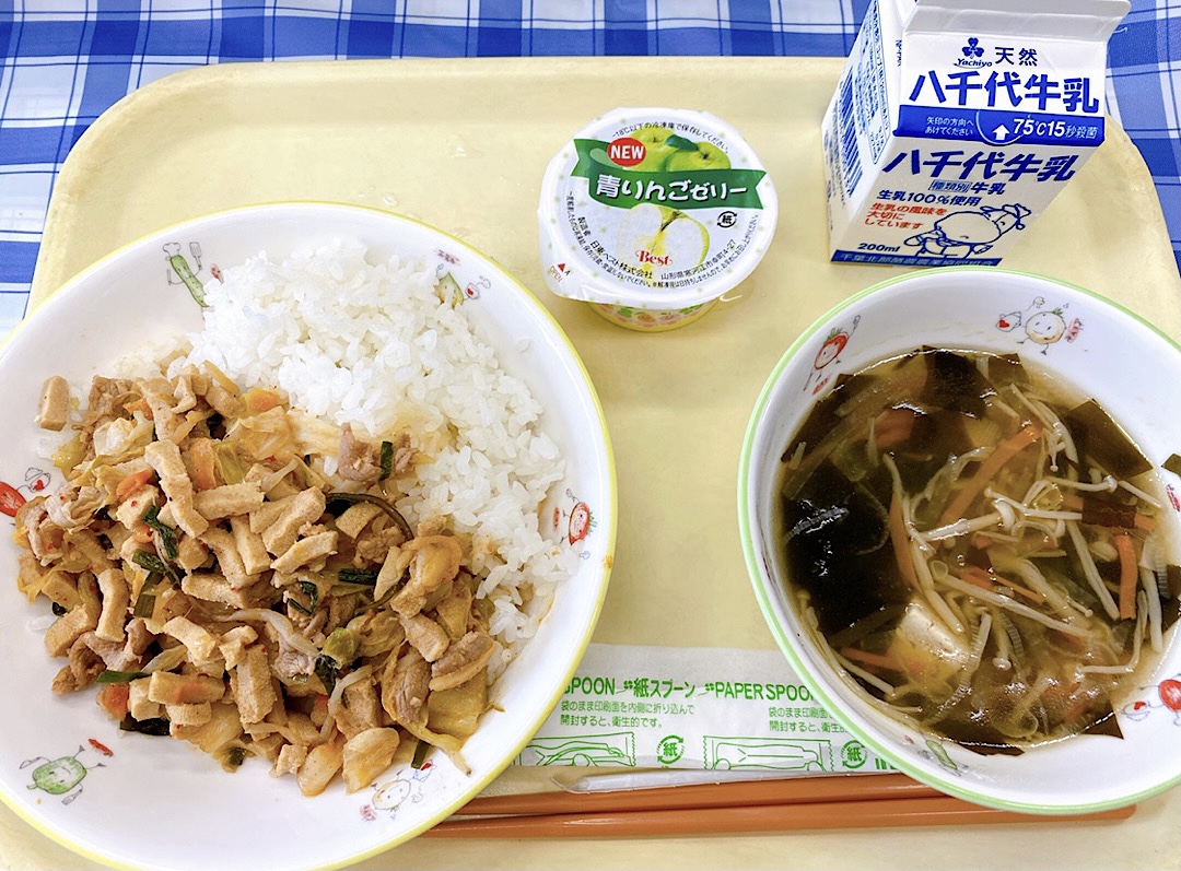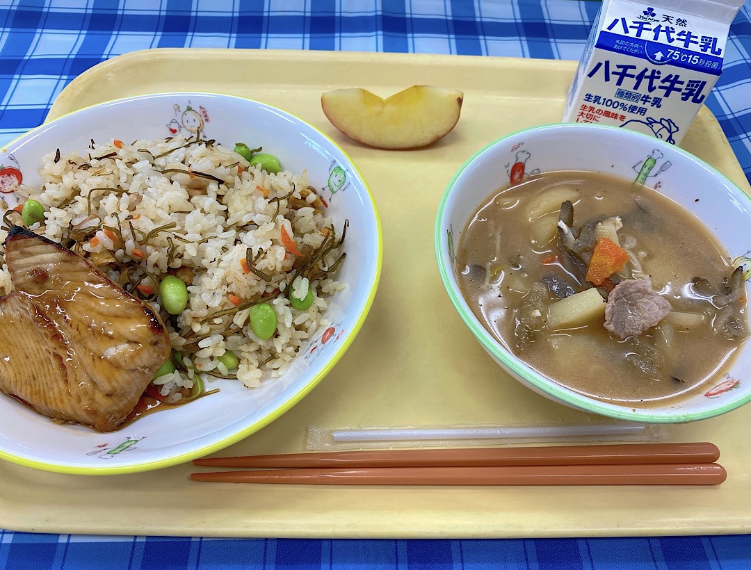 わかめごはん、鶏肉の薬味ソースがけ、じゃがいもの味噌汁、りんご、牛乳