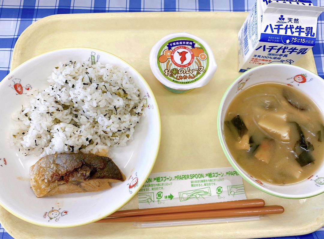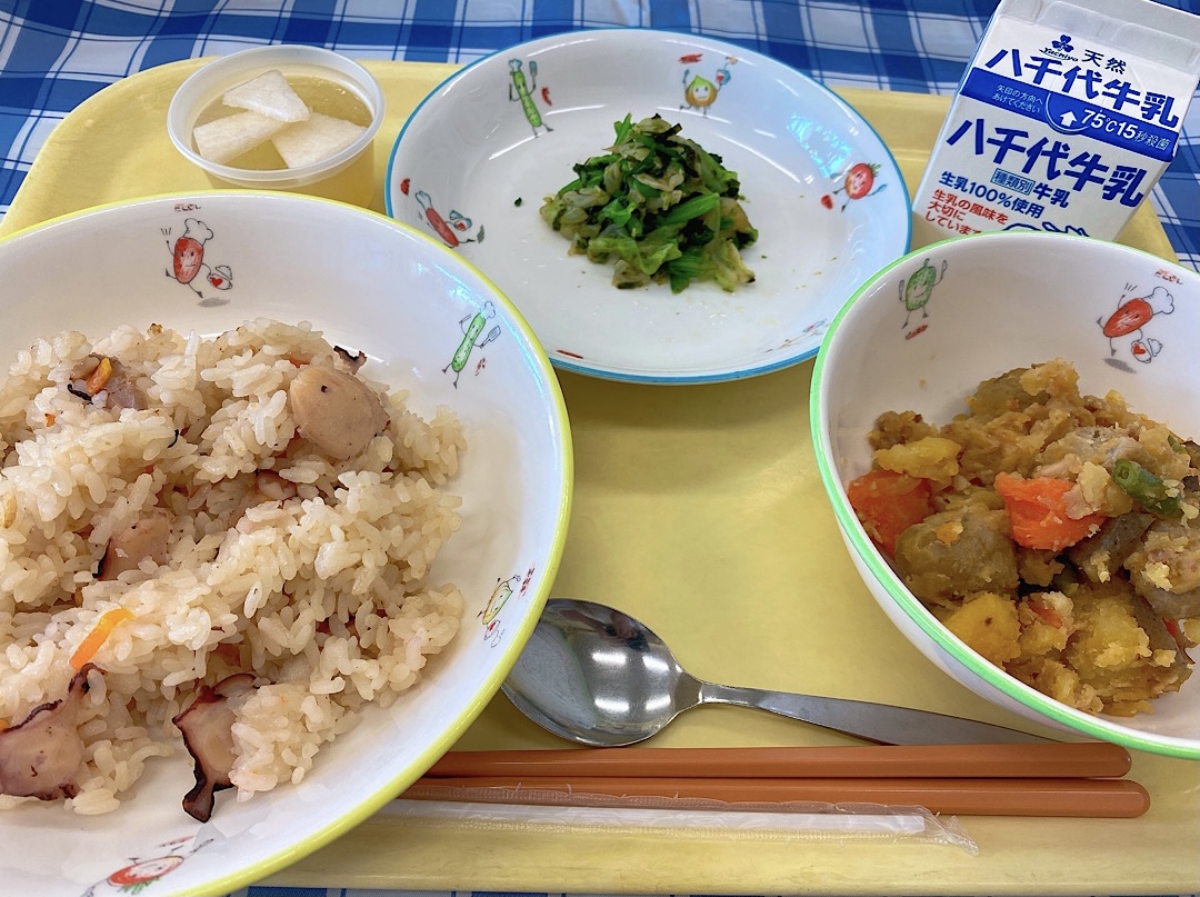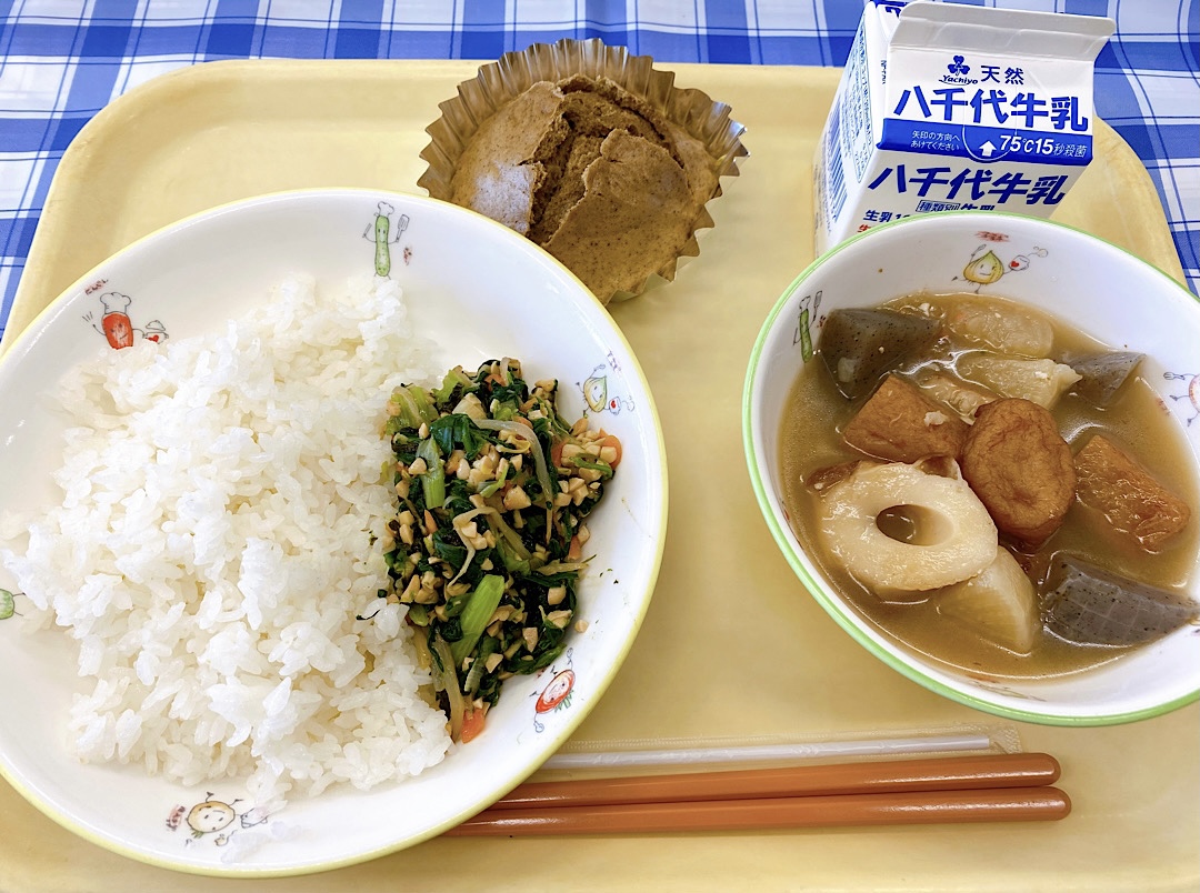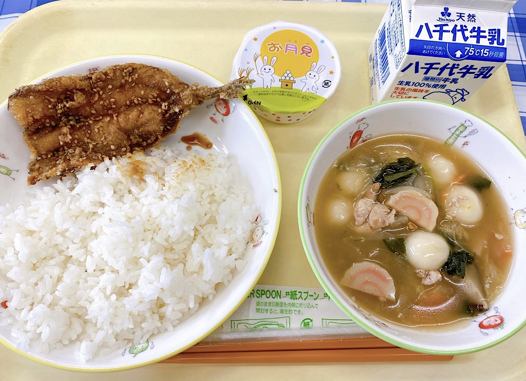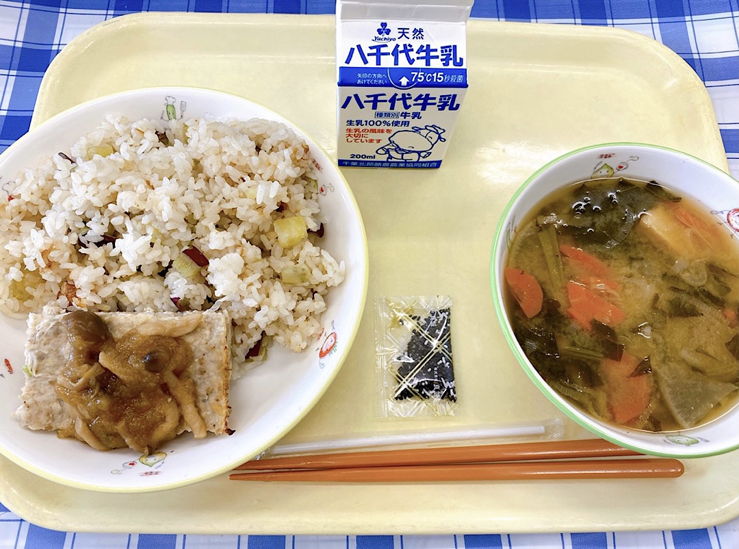 さつまいもごはん、いわしつくねのみぞれあん、千葉の恵み味噌汁、牛乳