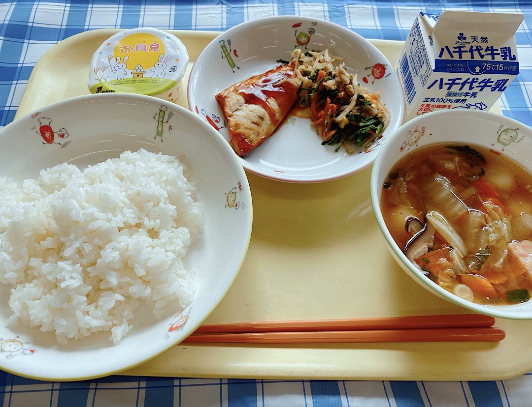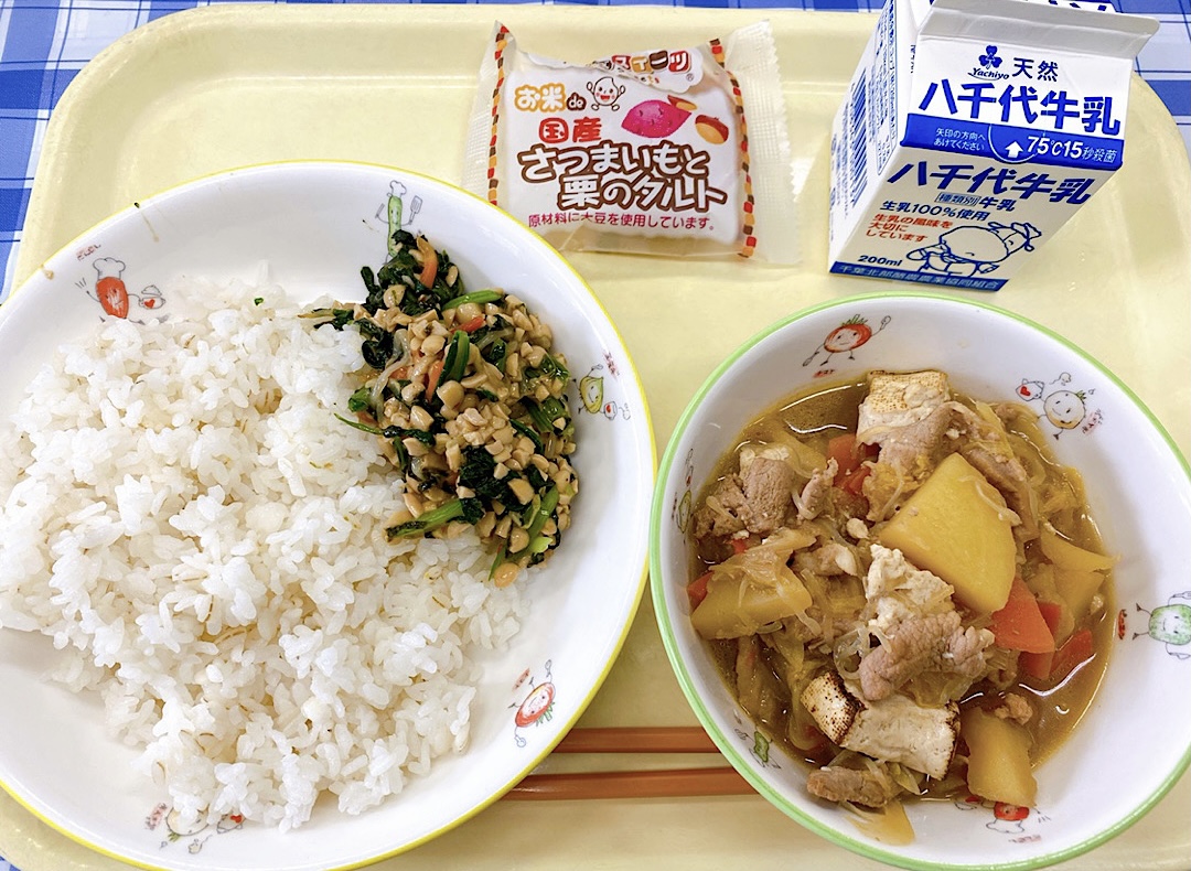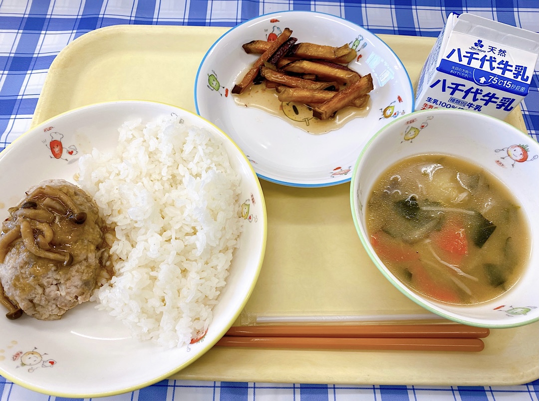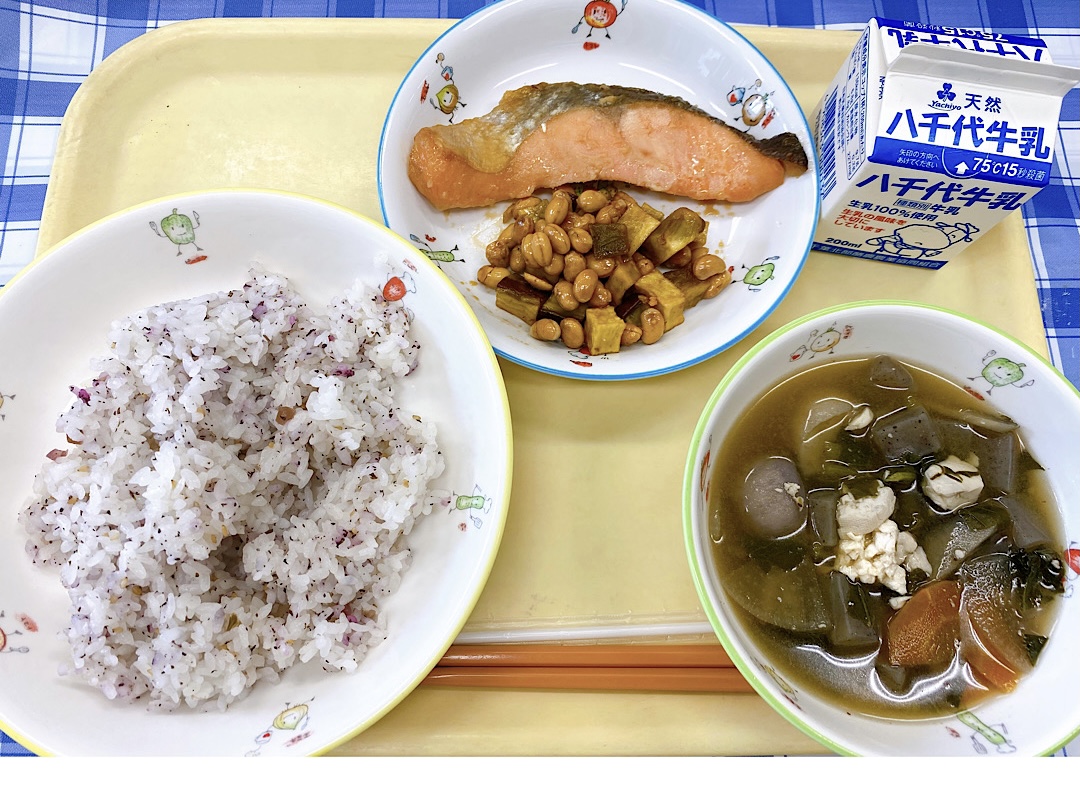 さつまいもごはん、いわしつくねのみぞれあん、千葉の恵み味噌汁、牛乳