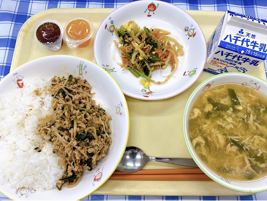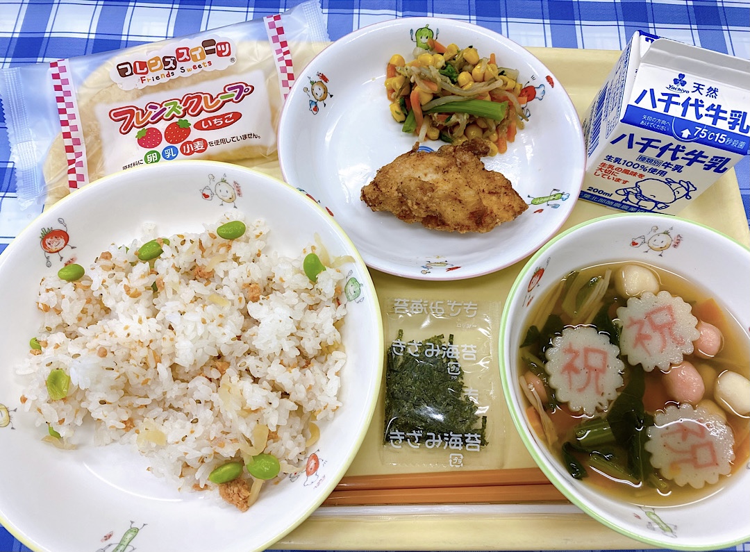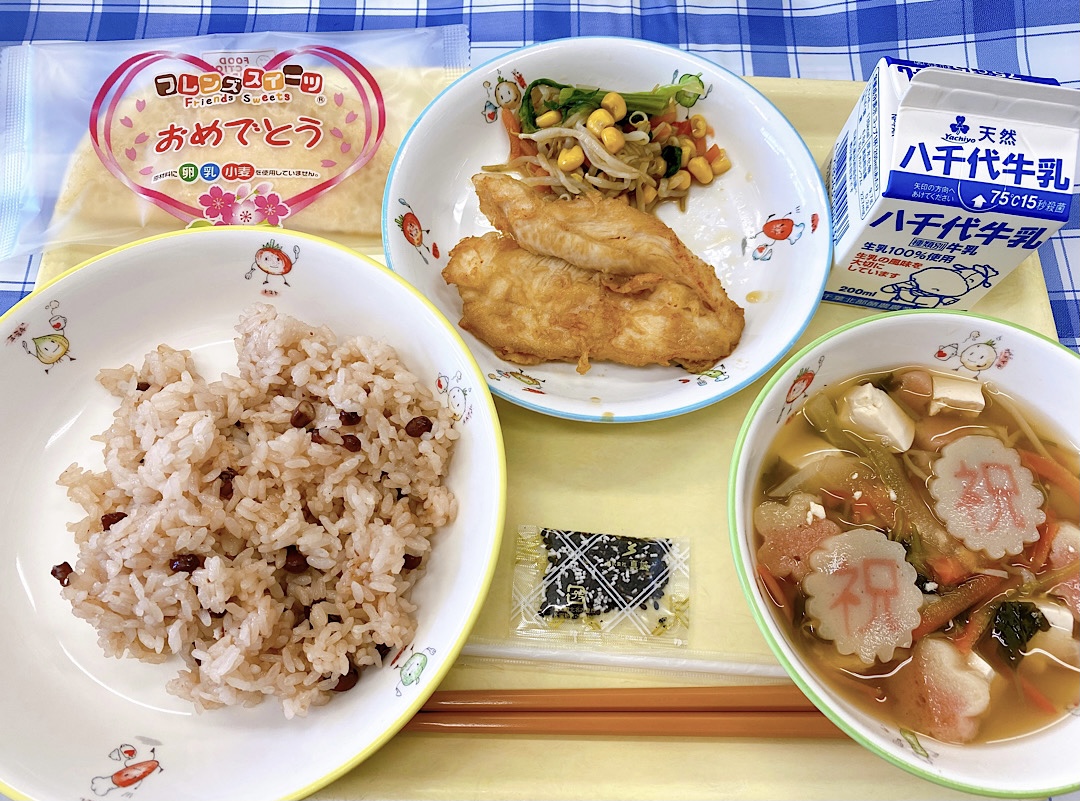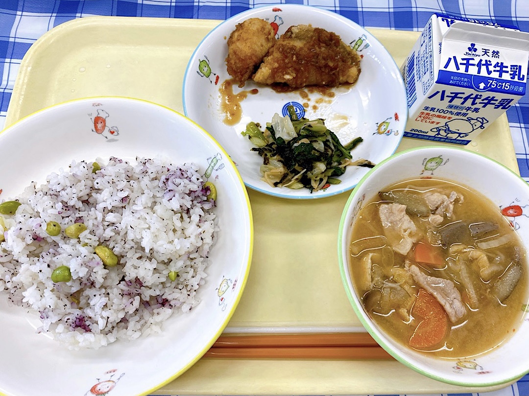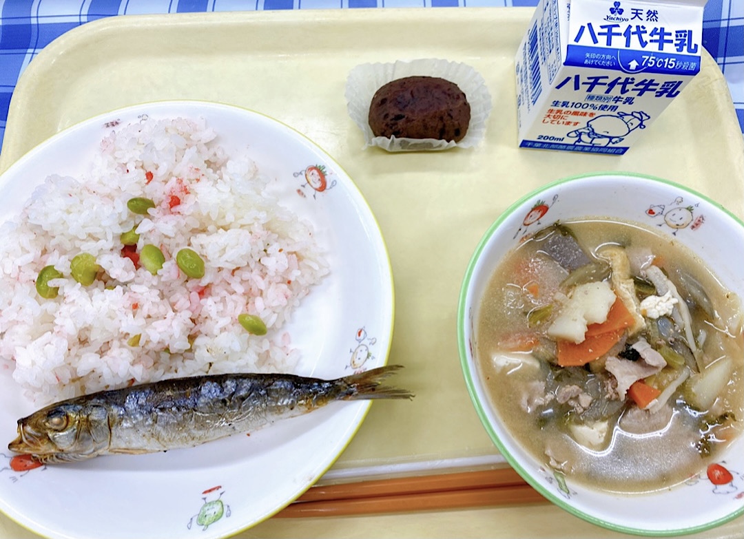 桜でんぶ入り枝豆ごはん、いわしの丸干し、ピリ辛豚汁、おばあちゃんのおはぎ、牛乳