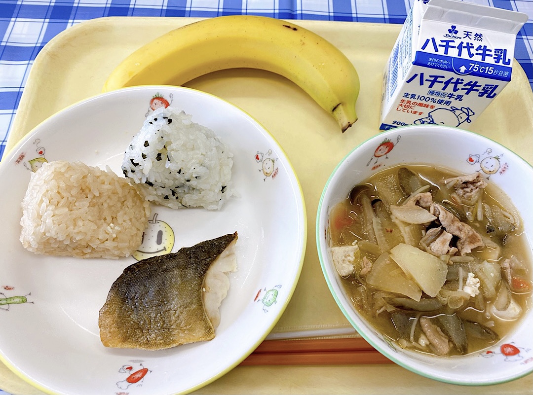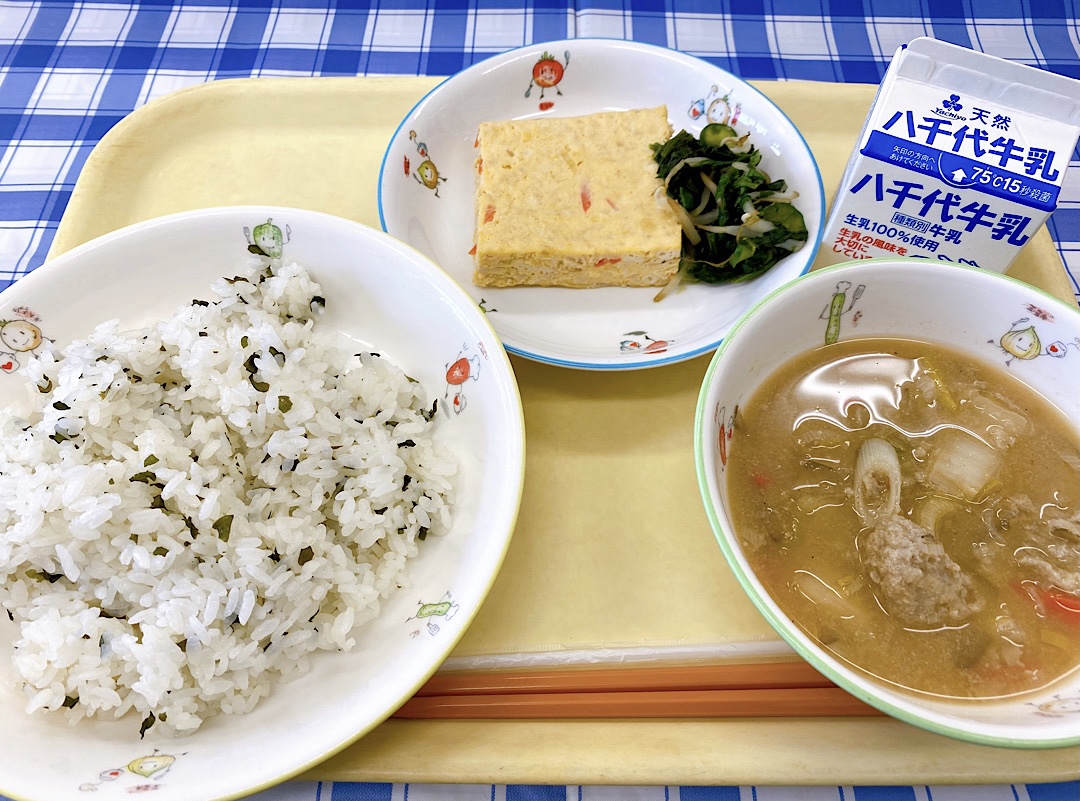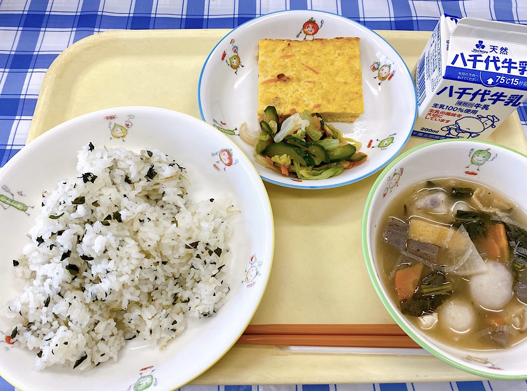 ゆかりごはん、鮭の味噌マヨネーズ焼き、豚けんちん汁、牛乳
