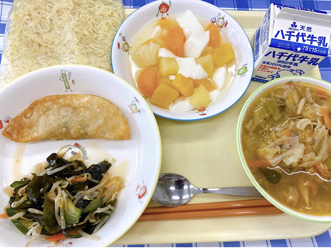 中華麺、ポニョ風五目ラーメン(具)、ポテト春巻き、カリオストロのワインゼリー、牛乳