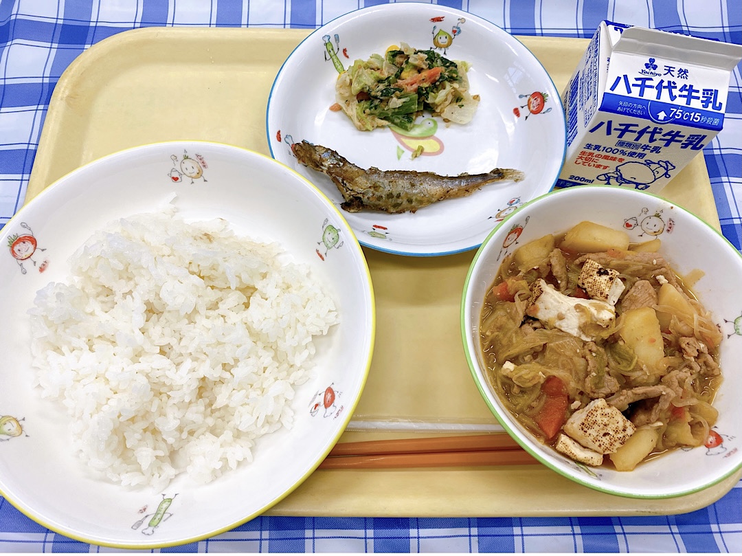 ごはん、すき焼き風肉豆腐、ししゃもの磯辺揚げ、ごまマヨ和え、牛乳