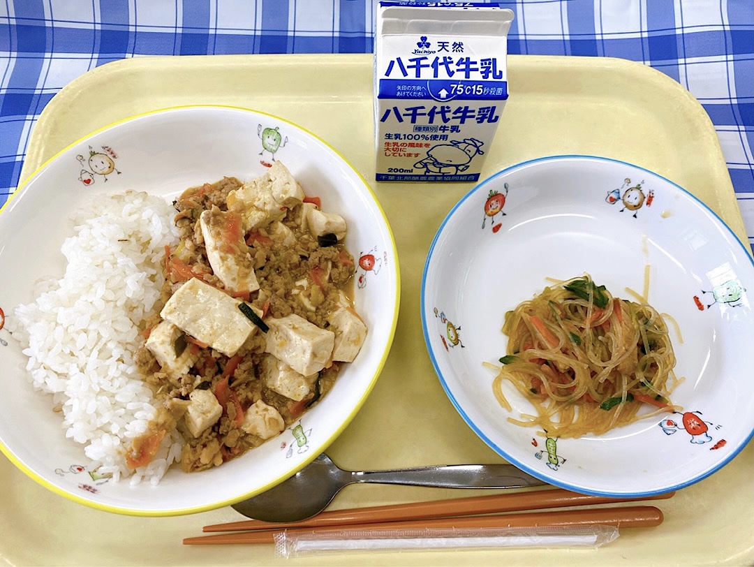 麦ごはん、麻婆丼(具)、バンサンスー、牛乳