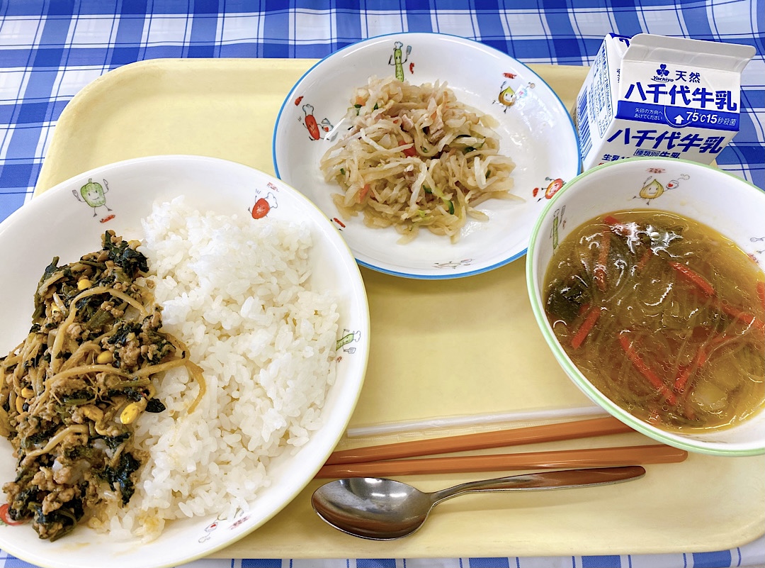 桜でんぶ入り枝豆ごはん、いわしの丸干し、ピリ辛豚汁、おばあちゃんのおはぎ、牛乳