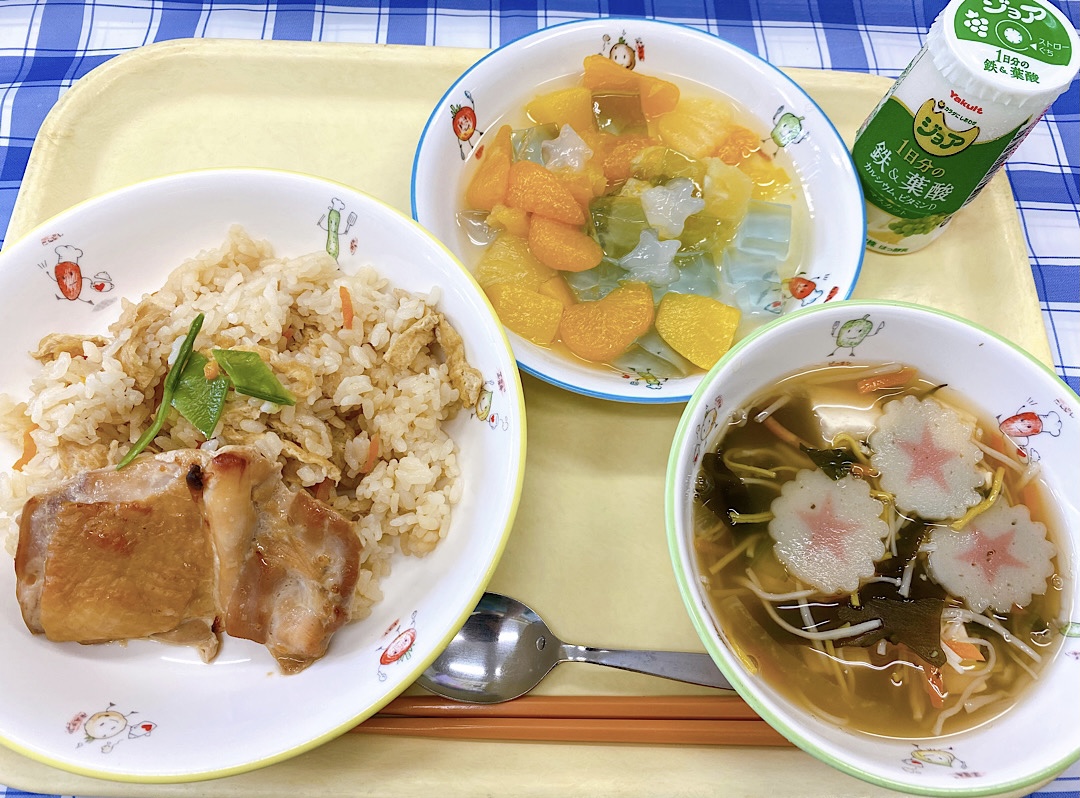 菜飯ごはん、いなだの西京焼き、生揚げの味噌汁、お米のババロア(みかん)、牛乳