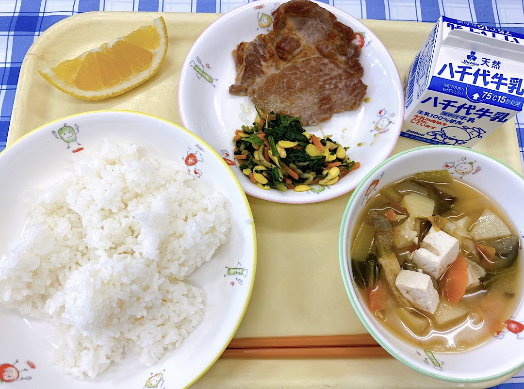 【千産千消献立】ごはん、千葉県産のりの佃煮、豚肉の三味焼き、さつま汁、黒蜜きな粉もち、牛乳