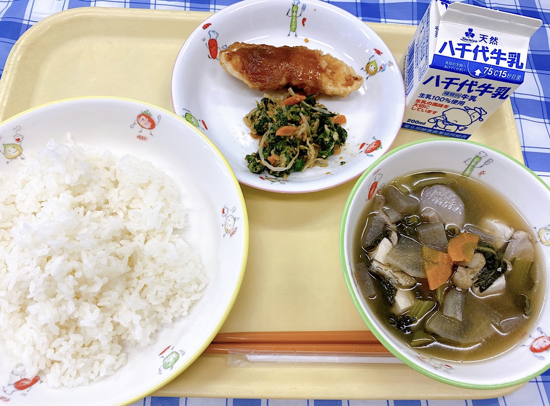 牛乳、米、のり、豚肉、小松菜、にんじん、ねぎ、大根、ごぼう、さつまいも、せいがく餅(せいがく餅とはうるち米で出来たお餅で、千葉の伝統食材です)