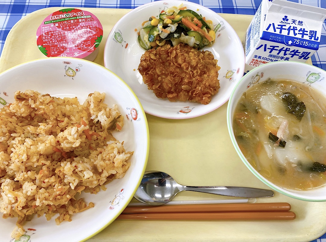 ハムピラフ、いかのサラサ揚げ、コンソメスープ、牛乳