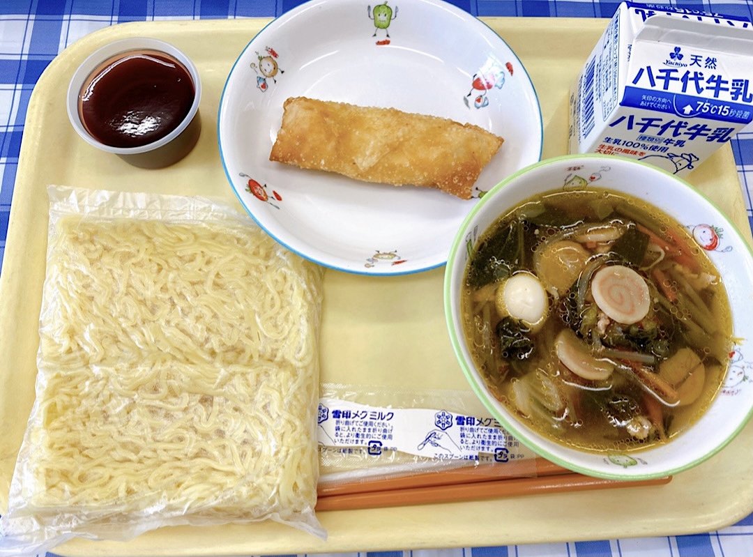 中華麺、味噌ラーメン(具)、鶏のから揚げ、中華和え、牛乳