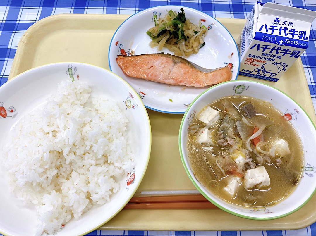 ゆかりごはん、鮭の味噌マヨネーズ焼き、豚けんちん汁、牛乳