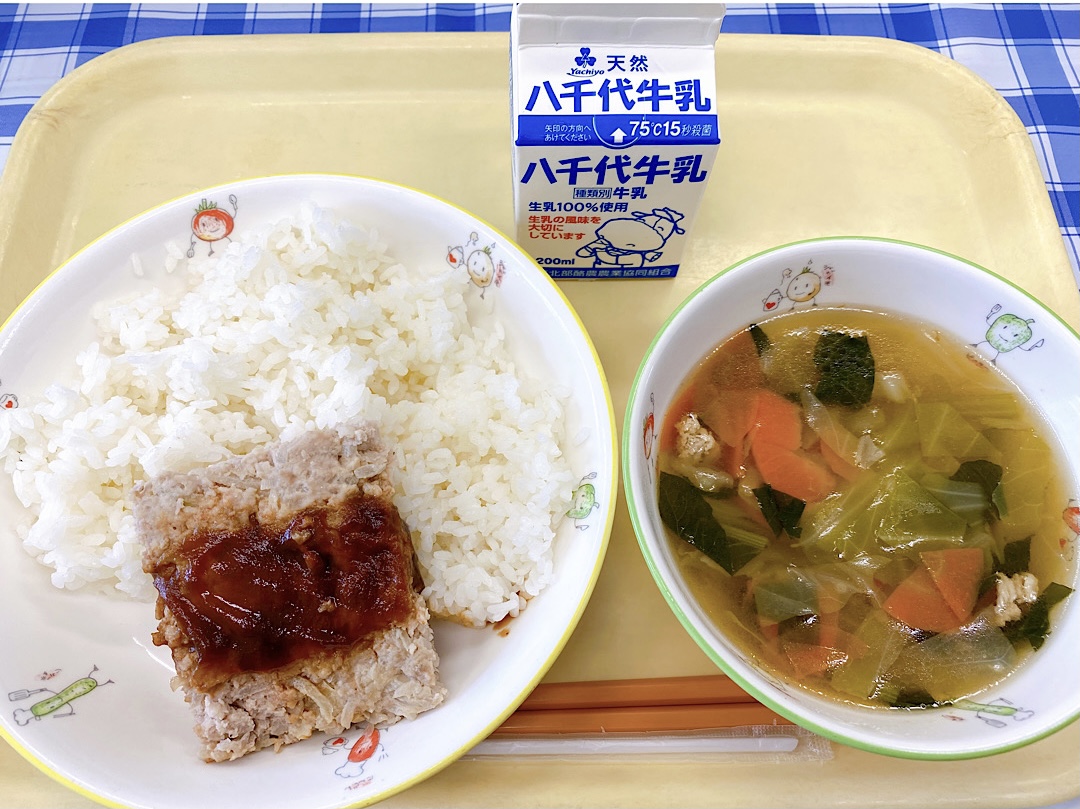 きつねごはん、キャベツメンチ、大根の味噌汁、牛乳