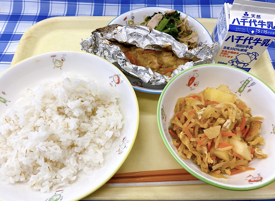 - 麦ごはん、鮭のちゃんちゃん焼き、三色和え、切り干し大根の含め煮、牛乳