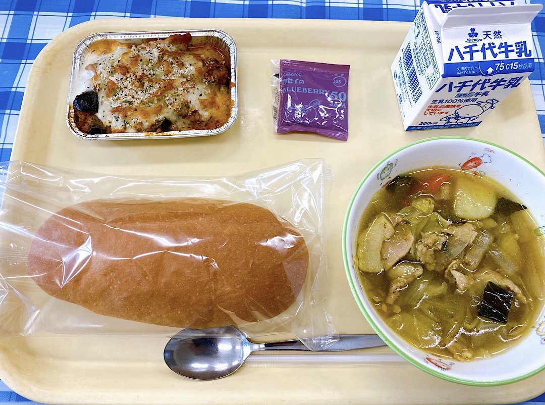 - コッペパン、ブルーベリージャム、ムカサ(ギリシャ風ミートグラタン)、スープカレー、牛乳