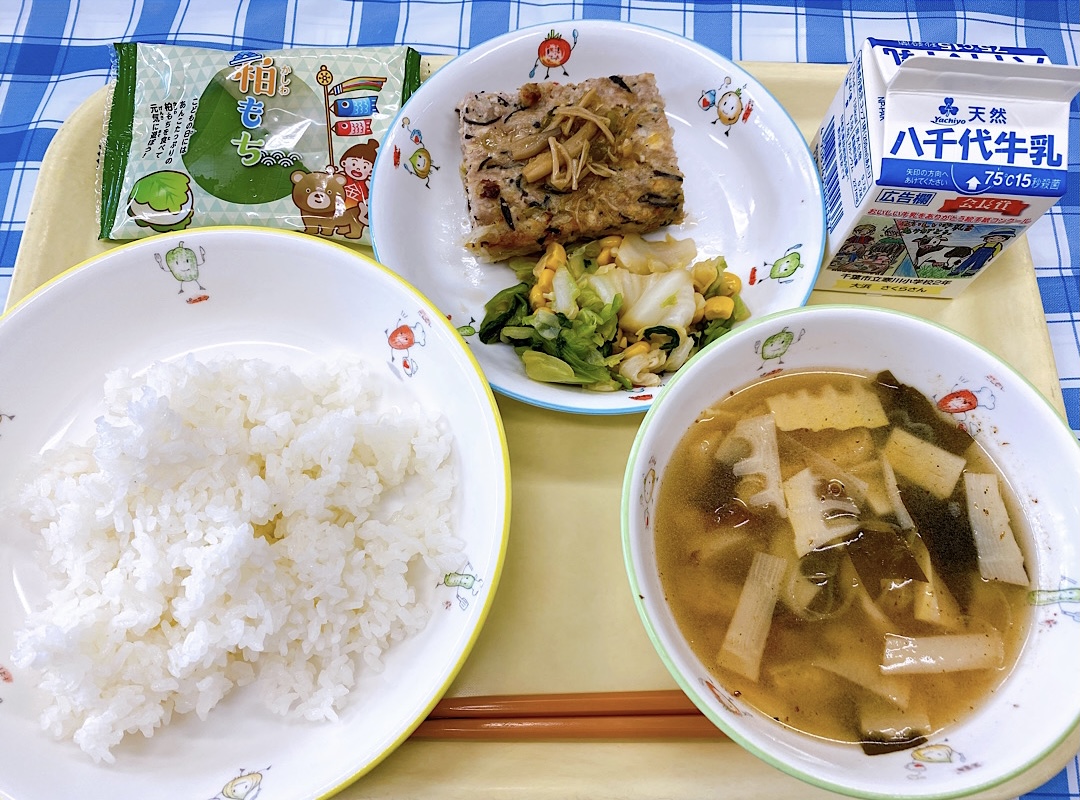 - 【端午の節句献立】 ごはん、豆腐ハンバーグ、コーン和え、若竹汁、柏餅、牛乳