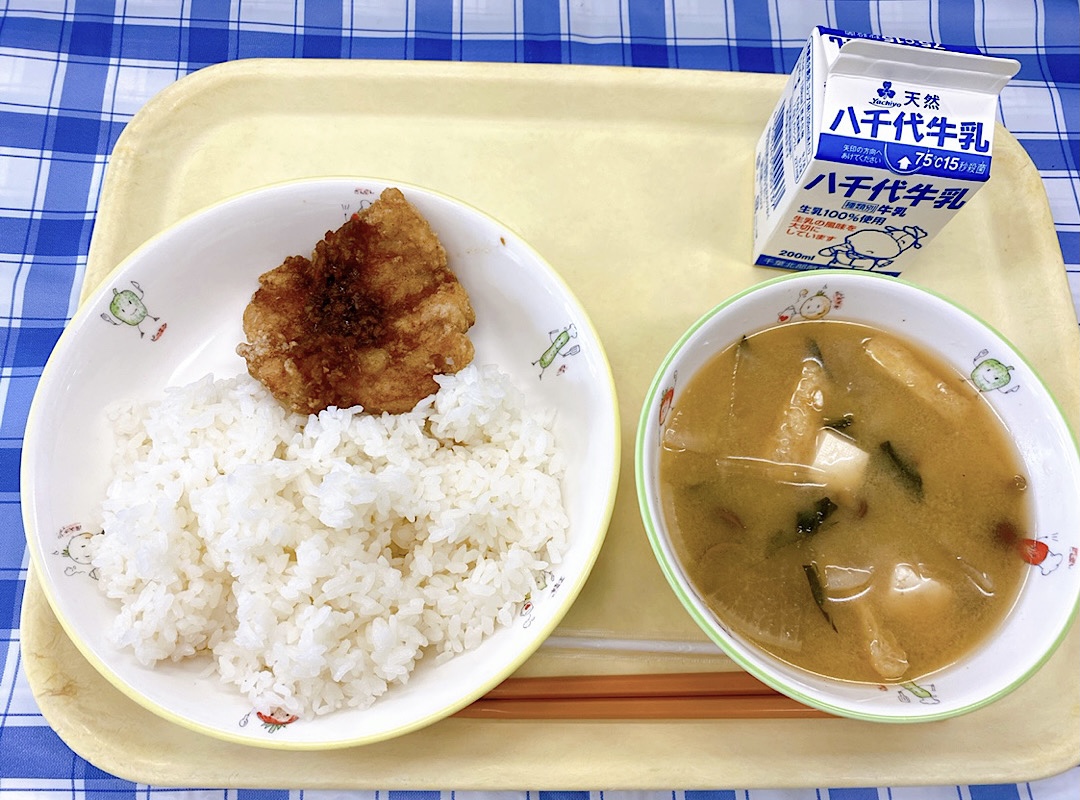 - ごはん、油淋鶏風鶏のから揚げ、なめこの味噌汁、牛乳