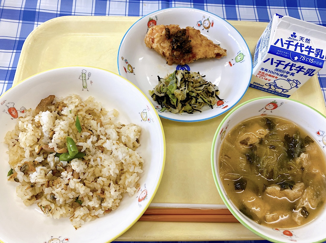 - 深川めし、めばるの薬味ソースがけ、じゃこあえ、小松菜の味噌汁、牛乳