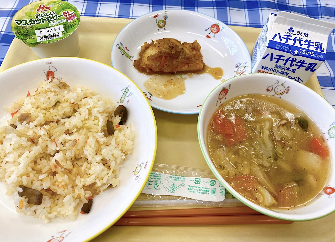 - 【毎月19日はもりもりデー(食育の日)】 ハムピラフ、いかのマリネ、コンソメスープ、マスカットゼリー、牛乳