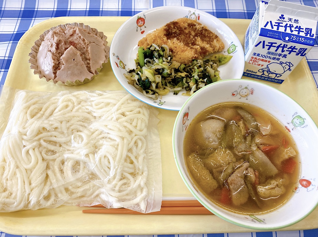 - うどん、けんちんうどん(具)、さめカツ、のり和え、いちご蒸しパン、牛乳
