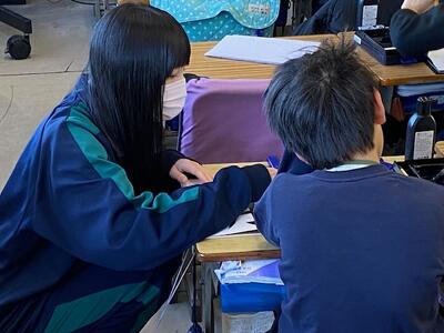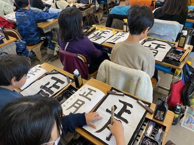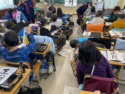 今年は体育館のエアコン工事のため、どの学年も教室で半紙を使った書初め練習に取り組んでいます。今日は市川南高等学校、書道部の顧問の先生と生徒さん11名が、3年生の書初め練習の支援に来てくださいました。
