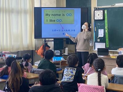 今日もALTの森田イアラさんが来校。2年生が英語の自己紹介に挑戦です。ドキドキしながらも手を挙げて「My name is ~」と チャレンジする友だちに「すごい、すごい」と大きな拍手。みんなの笑顔が素敵でした。