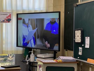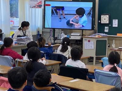 ほうきの使い方、片づけ方、ぞうきんのしぼり方など、環境美化委員会の子どもたちによる説明はとてもわかりやすく、クイズを楽しみながら子どもたちは画面に見入っていました。