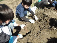 わくわく農園で栽培していたサツマイモの収穫を行いました。子ども達は、軍手をはめて気合十分です。ボランティアさんへ元気よく挨拶をし、いざ収穫!