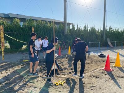 先生たちも、スコップやトンボで砂場をならしながら応援しています。