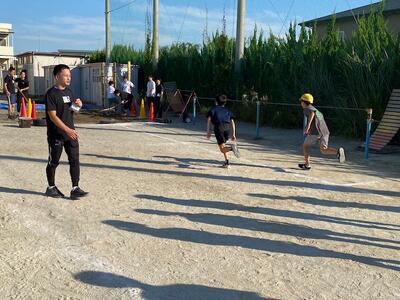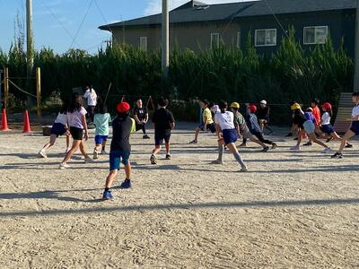 秋晴れの下、陸上部の練習が始まりました。元気に幅跳びの練習に集まった5・6年生の子どもたちは、準備運動のあと歩幅を合わせたり、フォームを確認したり。