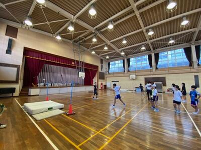 今日から体育館では高跳びの練習が始まりました。先生と一緒に低い高さのハードルをリズムよく跳び越える練習や、踏切足の確認。最後、実際にバーを跳び越える子どもたちはとても真剣でした。