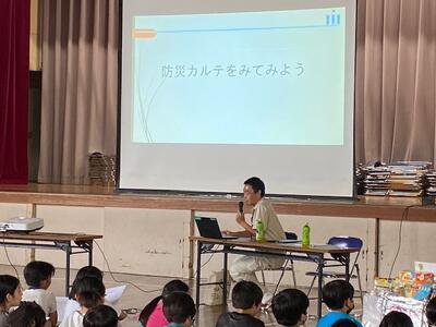 今日は、信篤地区が災害に見舞われた場合、どのような被害や影響を受けるのか、市川市危機管理室地域防災課の方々からお話を伺いました。「~って聞いたことありますか?」「これは見たことある?」という問いに、そのたびたくさんの手が上がり、地域防災課の方がたは驚いていました。今まで自分たちで調べ学習やインタビューの活動を行い、情報収集していたからですね。