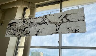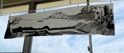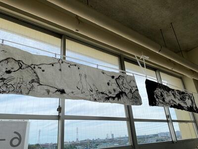 6年生の廊下に「墨絵」が飾ってありました。グループでかいたのでしょうか、墨の濃淡を生かした繊細な表現。かなり大きな作品です。
