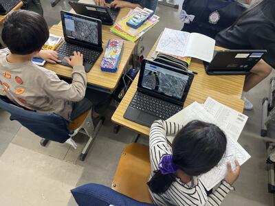 3年生が真剣にタブレットに向かっています。「わたしたちの市のくらし」の学習で、市川市の航空写真を見たり、地形を調べたりしています。