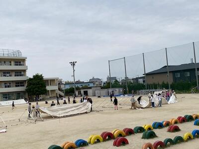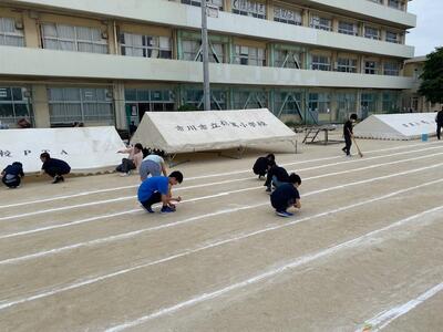 いよいよ明日は運動会です。午前中は、お互いに他学年の演技を見あう姿も見られました。午後は6年生や先生たちが会場の設営や準備です。