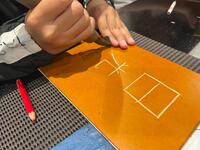 日光彫りは、『ひっかき刀(とう)』という専用の彫刻刀を使って行います。学校で使う彫刻刀とは異なる使い方ですが、専門の指導員の方の話を聞きながら取り組みました。