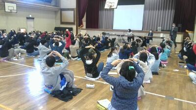 代表委員会が中心となって、体育館の舞台から各教室に演技の様子をオンラインで配信しました。1〜3年生の交流学級は、体育館で参観しました。