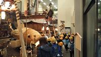 佐原の大祭で使う、山車が展示している山車会館を見学しています。山車の迫力に圧倒されています。
