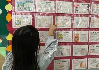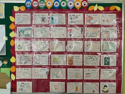 読書の秋。図書室の廊下には「先生からみなさんへ おすすめの本」が貼りだされました!「私のクラスの先生のおすすめの本は、これなんだよ」と、うれしそうに子どもたちが口々に教えてくれます。詳しくは、図書館からのおたよりをどうぞごらんください。