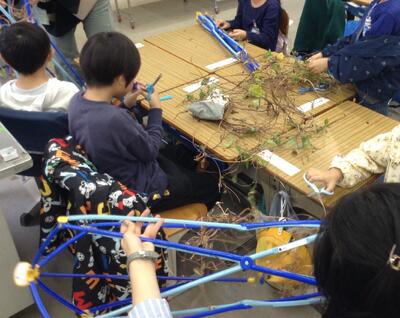 立派に育ったつるは、支柱から外すだけで一苦労。お友達や、保護者の方、地域の方に手伝ってもらいながら、丸い形にして、かざりをつけて、一生懸命作りました。子どもたちはとても楽しそうで、出来上がったリースを笑顔で見せてくれました。