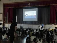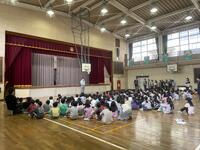 感染症対策のため、1年生と代表委員会は体育館、ほかの児童は教室からオンラインで参加しました。