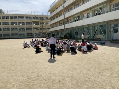 休み時間に校庭を見てみると、小さな1年生に囲まれた6年生の姿が見えました。どうやら、1年生と一緒に鬼ごっこをして遊んでいたようです。「こっちに集まって~」と1年生に声をかけていました。