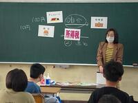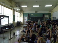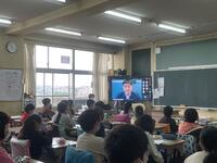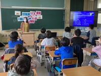 まずはじめに、特別支援学校の先生が来てくださり、学校での学習や生活の様子を、映像や先生方の演技、クイズなどを通して教えていただきました。小学部から中学部、高等部のみんなが食堂に一堂に集まり給食を食べている写真を見て、人数の多さに驚きの声が上がりました。