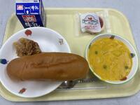 ソフトフランスパン、とりのから揚げ、パンプキンシチュー、牛乳、クリスマスデザート